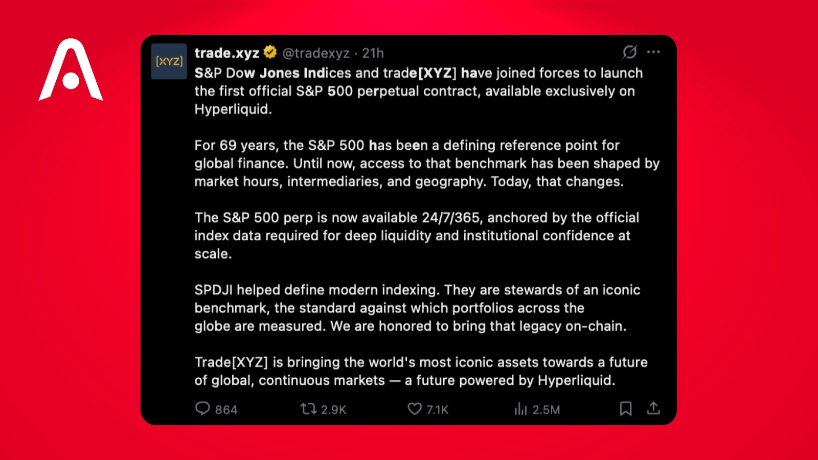 Trade[XYZ] operates as the product layer responsible for structuring synthetic exposure to traditional financial benchmarks such as the S&P 500. By combining licensed index data with crypto-native derivatives infrastructure, it creates instruments that translate established market references into continuously tradable onchain contracts. This role connects traditional index licensing frameworks with decentralized execution environments.